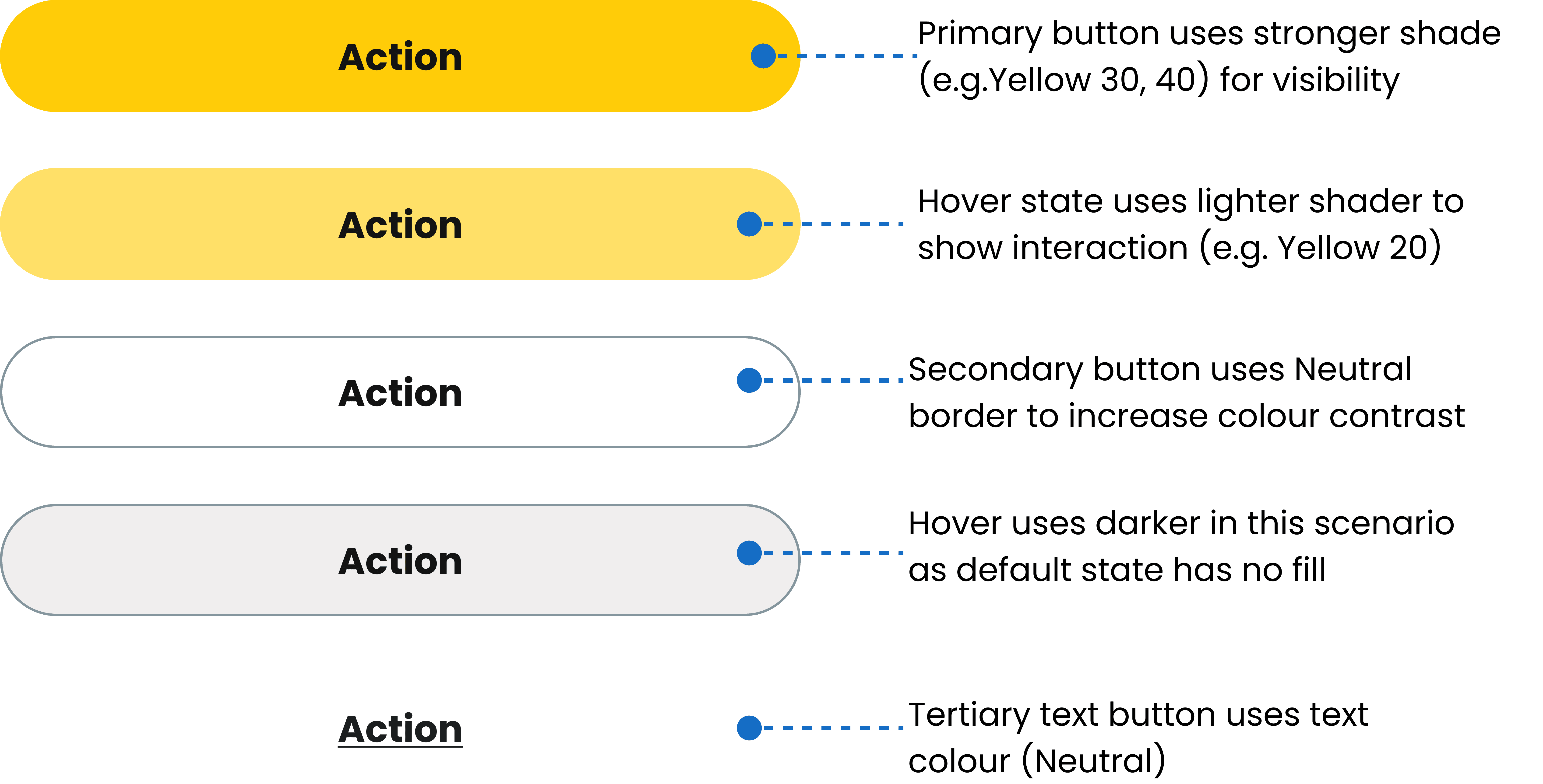 With insights in hand, I started to define the button system: what types we needed, which states were essential, and how styles should work together. I brought early ideas to design stand-ups, discussing options with the team and iterating on their feedback. This collaborative approach made sure that the system would meet both design and development needs.