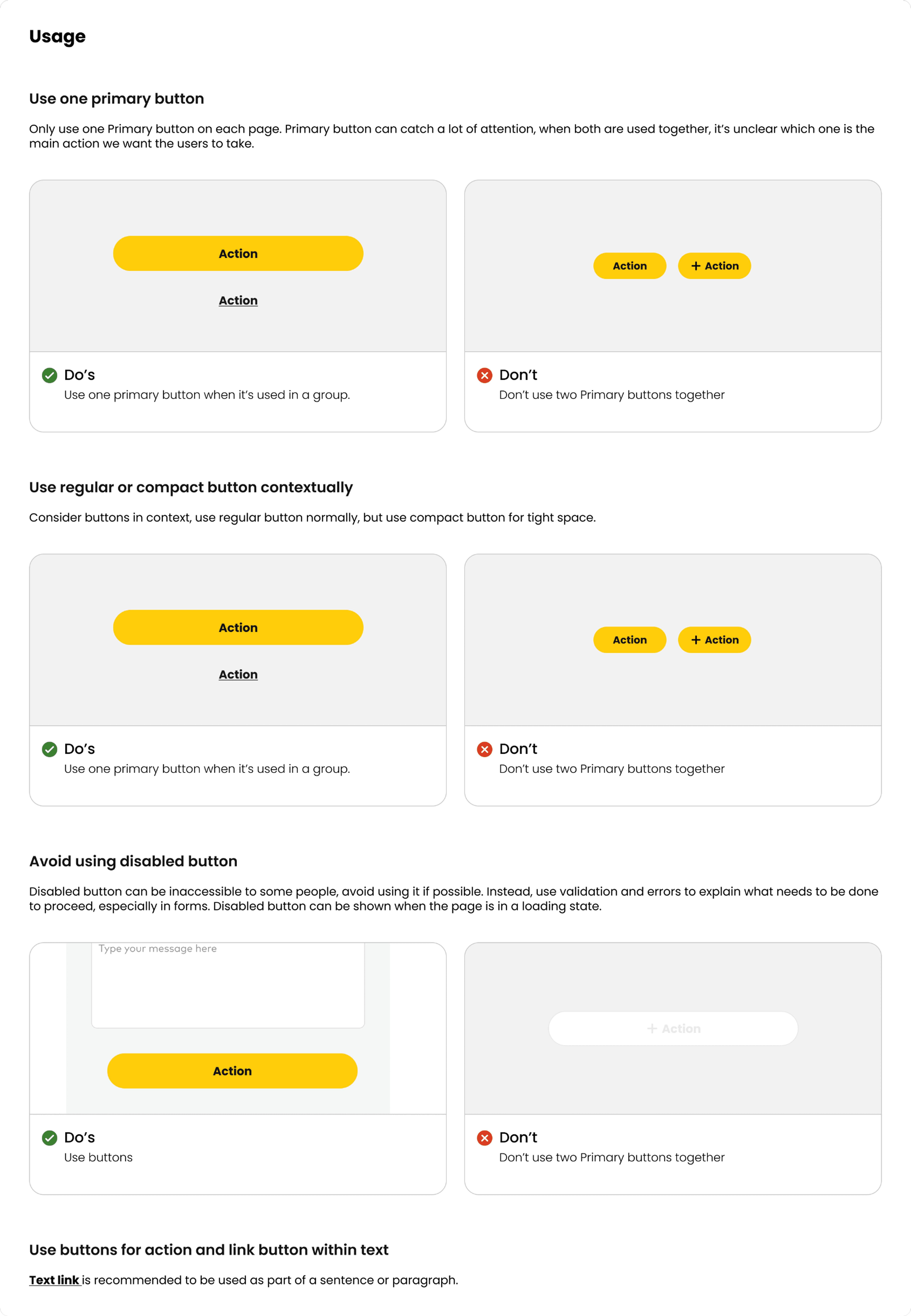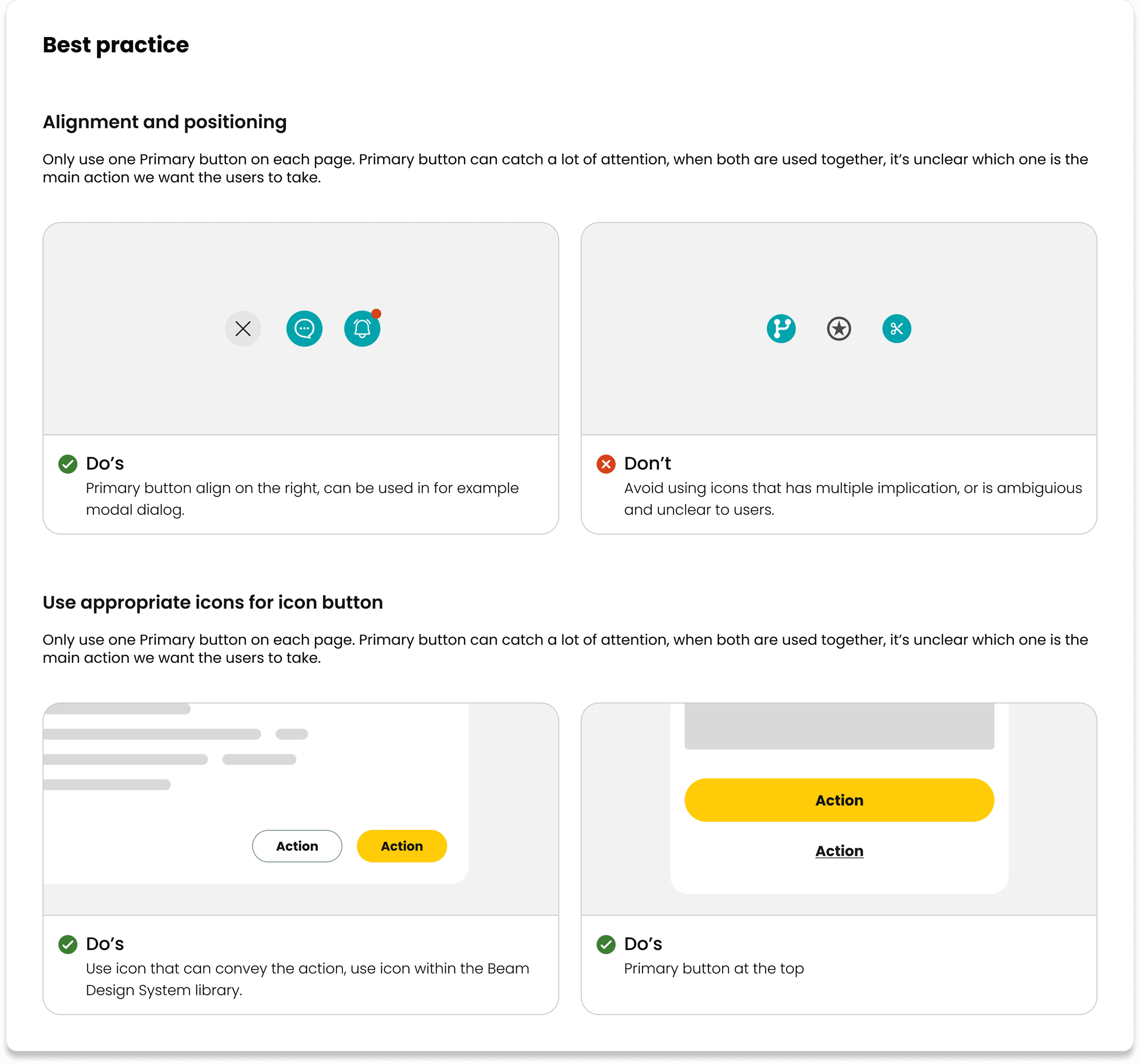 To ensure consistent use across the team, I documented the button anatomy, states, and best practices, including clear Do’s and Don’ts. The documentation started in Figma and was planned to live on Beam’s website as the single source of truth for the App and Web teams.