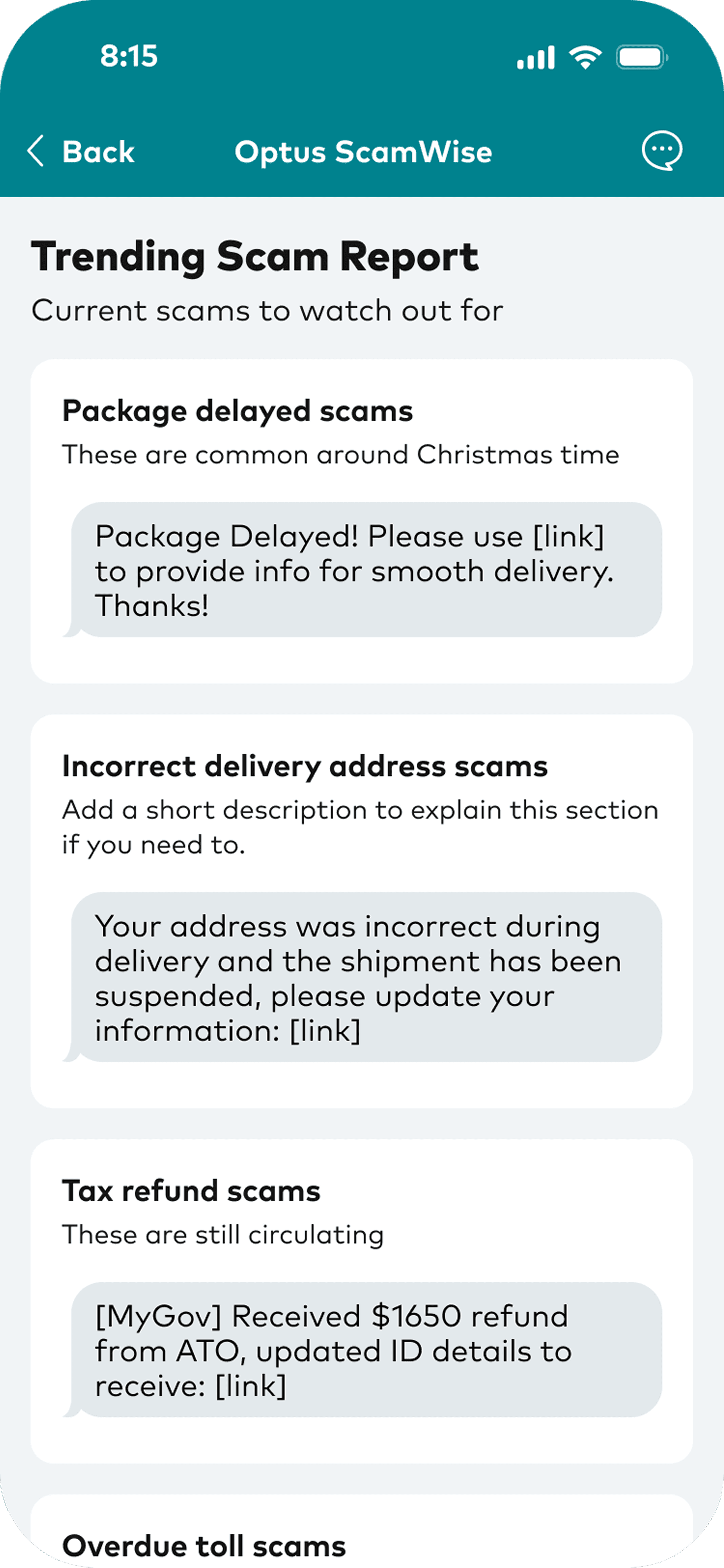 An app feature for customers to learn about, identify and report scams following the Optus data breach.